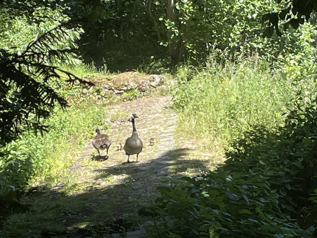 Après être repassés sous la ligne de chemin de fer, nous entrons dans le Parc des deux rivières à Yerres, puis dans l’Île Panchout, en suivant le Chemin des Poètes (sentier jalonné de panneaux affichant quelques poèmes parmi les plus beaux de la langue française). Tout au long de cette promenade, nous sommes accompagnés par le clapotis de l’eau et les chants d’oiseaux, et nous avons l’occasion de rencontrer quelques habitants des domaines aquatiques : un héron nullement dérangé par notre présence, un cormoran juché au faîte d’un grand arbre, ainsi que des poules d’eau, des canards et des oies bernaches précédées de leurs petits (Photo 4).