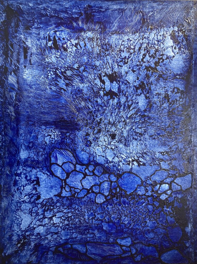 Dans l’Orangerie, située dans le parc, la transition est radicale avec l’exposition « Matière-Lumière » de l’artiste allemande Evi Keller (née en 1968). Nous sommes accueillis par de très grands panneaux d’un bleu intense où se détachent des formes enchevêtrées brillantes comme du cristal (Photo 8). Sont exposées conjointement des photographies remarquables qui semblent représenter des arbres éclairés par la lumière d’une lune blafarde se reflétant sur une étendue d’eau calme.