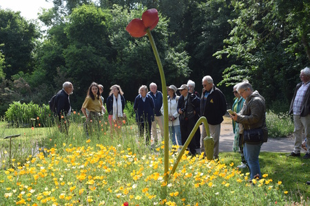 Nous y sommes accueillis par Luanne, qui nous fera découvrir les deux jardins conservatoires. Nous commençons par le jardin des plantes sauvages, qui regroupe par thèmes 1 000 plantes de la région : « les parents sauvages des plantes potagères et maraîchères » avec les ancêtres de la salade, de la betterave, etc… ; les anciennes variétés de céréales (le blé-épeautre, l’avoine « noire de Roye »…) ; les rosiers, où l’on apprend que les insectes pollinisateurs plébiscitent les églantines pour leur pistil plus accessible ; « les beautés mortelles », dont l’aconit, la plante la plus toxique d’Europe ; les plantes tinctoriales ; les plantes utilisées pour le tissu, comme les orties…
