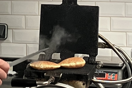 C’est à ce dernier modèle qu’appartient sa production. Ce sont des gaufres rondes, cuites 4 à la fois dans des moules belges imposants. L’un des secrets est de les faire cuire rapidement, à 250°. Quand on les sort du moule, elles sont gonflées, presque sphériques : il faut alors se hâter de les trancher en deux dans le sens de la longueur. Il reste ensuite à les fourrer avec un mélange de vergeoise et d’autres ingrédients… chaque boulanger ayant sa recette.