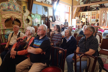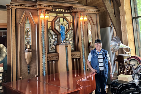 Il y a là plusieurs orgues de foire ou de danse, créés par les 3 grands fabricants flamands (aujourd’hui disparus) : Decap, Verbeeck et Mortier ; notre guide nous raconte alors l’étonnante histoire d’un orgue Mortier nanti d’une magnifique façade art déco en bois : avant la dernière guerre, il animait un dancing dans le Limbourg. Contraints à l’exil, les propriétaires ont édifié un mur pour cacher cet orgue, mais ne sont jamais revenus. Des années plus tard, il a été découvert par les nouveaux propriétaires, bien endommagé mais debout. Un collectionneur américain, propriétaire de cirque, s’y intéresse et le fait venir à Hawaï, puis s’en défait et l’orgue atterrit finalement chez Patrice Desnoulez, qui l’a remis à neuf.